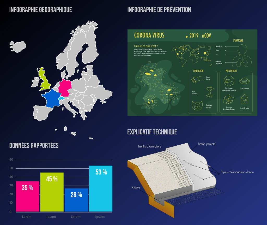 L’illustration, et notamment l’infographie, est généralement utilisée pour éclaircir, voire expliquer le propos, et se suffit souvent à elle-même.